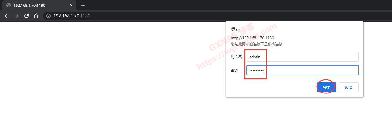 十五、在浏览器的地址栏,输入http://群晖的IP地址:1180 打开,输入用户名admin 和在上面第十个步骤设置的访问密码,登录;