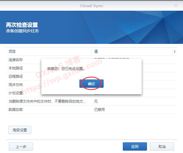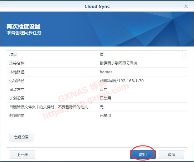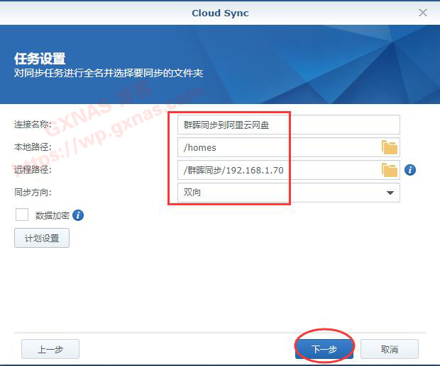 十九、设置好需要同步的群晖本地文件夹、阿里云盘上的远程文件夹和同步方向(可以设置成双向同步、群晖只上传阿里云盘、阿里云盘只下载到群晖),下一步;
