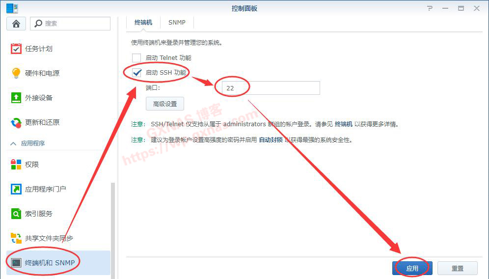 六、在群晖控制面板,终端机和SNMP,把“启动SSH功能”打勾,并设置一个端口(我这里就用默认的22端口,如果需要映射到公网的,建议把默认的22改成别的数字);