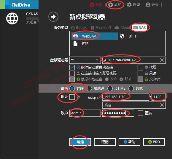 二十四、Win电脑想要加载阿里云盘,让它变成本地磁盘(网络磁盘),也很简单,需要一个软件RaiDrive(我用的是免费版的1.80,只能映射成网络磁盘不能选本地磁盘,如果你是付费会员是可以映射成本地磁盘的),在菜单上添加以下信息,确定: