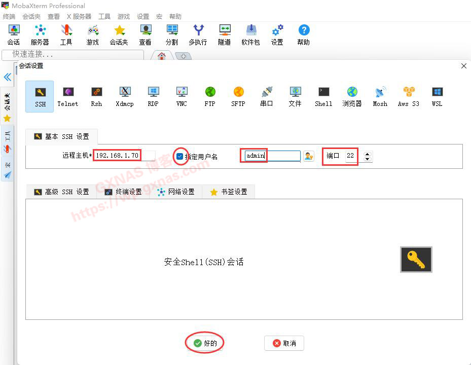 七、在Win电脑上打开SSH软件(我这里用的是 MobaXterm  ),填上群晖主机的IP地址、用户名、SSH端口号,点“好的”;