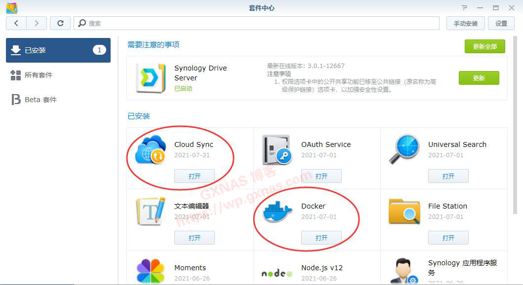 一、打开群晖套件中心,搜索:Docker 和 Cloud Sync ,下载安装,如果已经安装过的,此步骤可跳过;