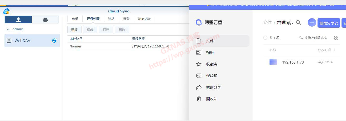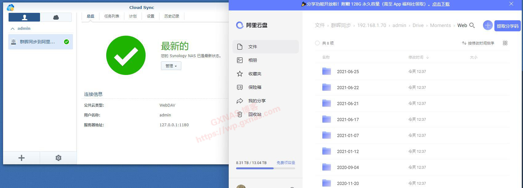 二十三、我的文件不多,所以很快就同步成功了(Cloud Sync显示打勾),右图的阿里云盘已经看到群晖的文件上传上来了;