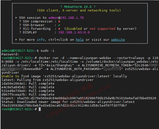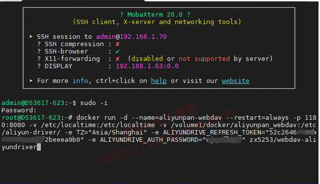 十、复制以下命令,并按照你的实际情况修改(其中:1180是访问端口,“阿里云盘的token”在上面第六步获取到;“访问密码”需要自己设置一个,建议用和群晖一样的密码,方便记忆,但是不要用类似123456这种弱口令;/volume1/docker/aliyunpan_webdav/是第四步骤复制的路径;),改好以后全选复制到SSH工具的界面按下 Shift + Insert 粘贴后回车: