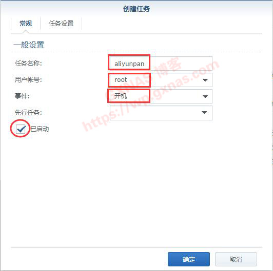 二十三、把任务名称写上、用户账号root、事件:开机,左下角的“已启动”打勾;