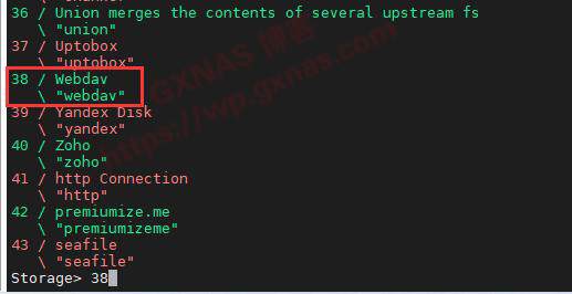 八、接下来这里会跳出一长串,需要选的Webdav协议序号是38,所以输入38回车(这个菜单的序号有可能会变,不要照搬,先看清楚是Webdav的序号再输入);