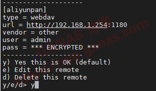 十六、这里会再次显示出我们前面设置的阿里云盘的Webdav配置,确认无误后,输入y回车;
