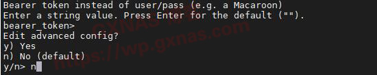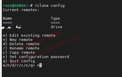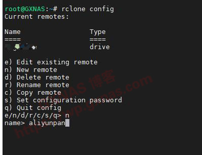 六、由于我之前已经加载过一个网盘,所以上面会显示有已经加载过的网盘名称和类型,如果你的NAS没加载过,是不会显示的。这次需要加载的是阿里云盘,所以输入n回车,新建一个;