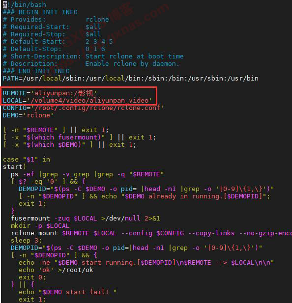 1、REMOTE='aliyunpan:/影视'这行,引号里面的aliyunpan是上面第七步骤设置的名称,我这里挂载的是阿里盘里面的“影视”这个文件夹,如果想挂载整个阿里云盘,直接写REMOTE='aliyunpan:/';