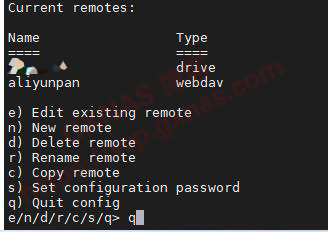 十七、可以看到阿里云盘已经配置好了,输入q回车退出配置;