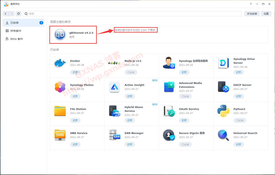 40、再回到套件中心,除了qbittorrent显示"安装的套件版本与您的DSM不兼容"用不了以外,其他的套件已经自动修复了。