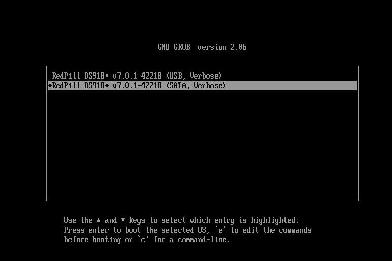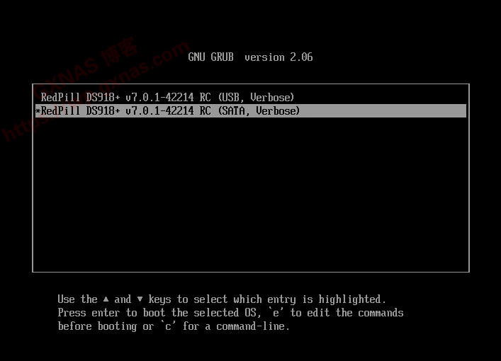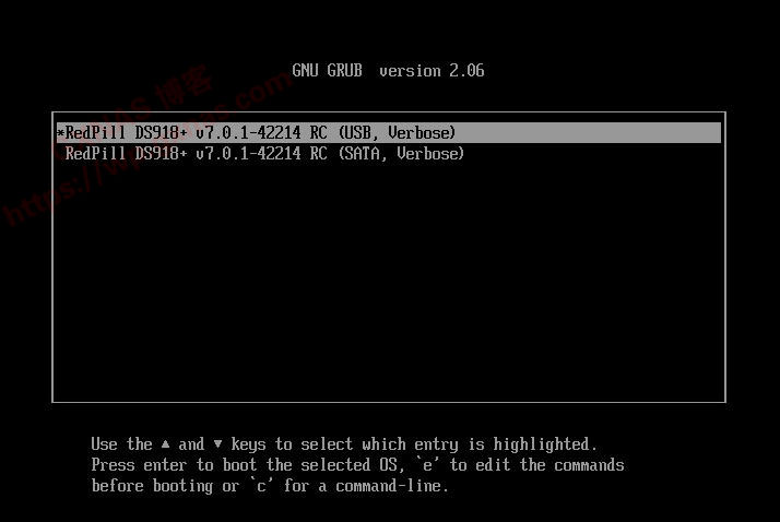 7、把群晖主机关机,重新做引导盘(不会做的,请参考【物理机安装DS918-7.01教程】、【ESXI虚拟机安装DS918-7.01教程】、【PVE虚拟机安装DS918-7.01教程】),如果是用U盘做引导盘的需要注意修改VID、PID,刷入DS918-7.01的引导文件后开机,开机后下图的引导菜单选第一个回车;