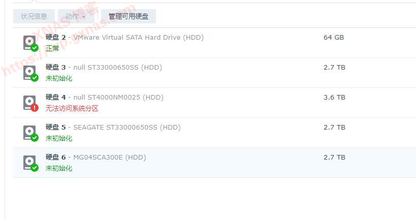 46、进入群晖系统后,在存储空间管理员,可以看到阵列卡的硬盘都在呢;