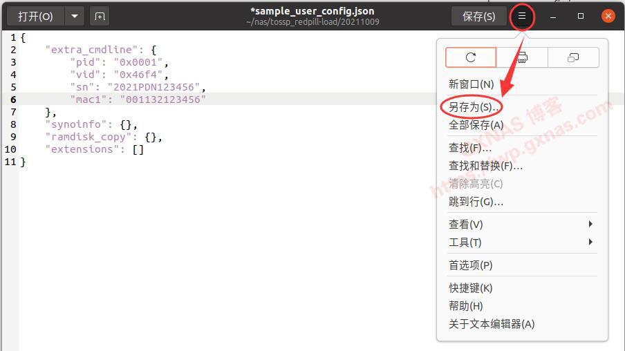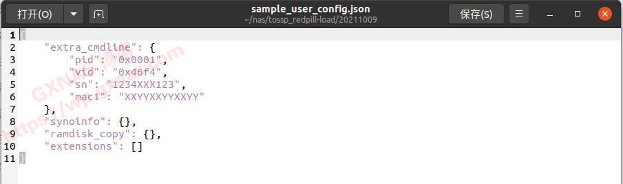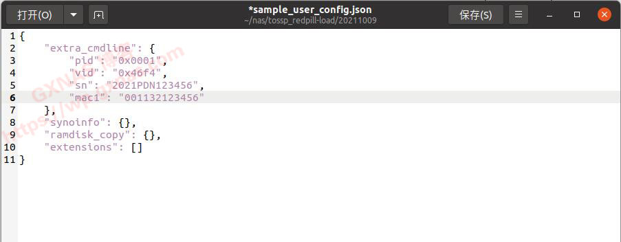 4、把以下代码复制,并根据实际修改好pid、vid、sn、mac1这四个参数,保存到redpill-load源代码的目录下,文件命名为:user_config.json;