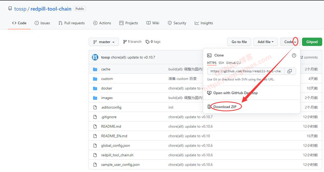 1、在电脑浏览器打开【tossp大神的RedPill引导一键编译源代码仓库】,在”Code“的三角形点出菜单,选择”Download ZIP“,打包源代码下载到本地电脑;