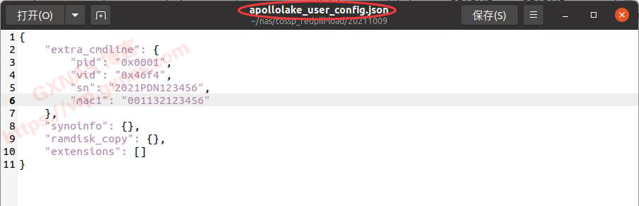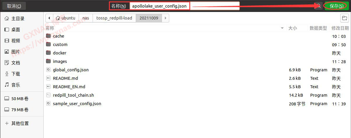 10、名称这里写:apollolake_user_config.json(编译DS918+的引导,必须要用此文件名,不可以更改),保存;