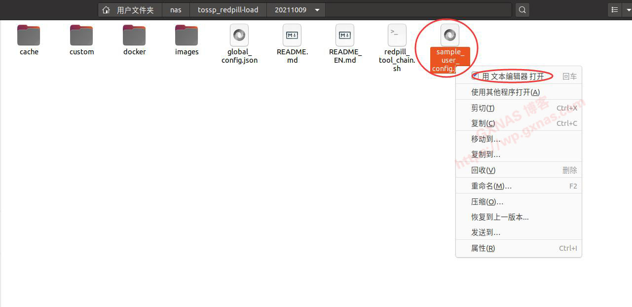 6、进入“20211009”文件夹,找到“sample_user_config.json”文件,右键,用文本编辑器打开;