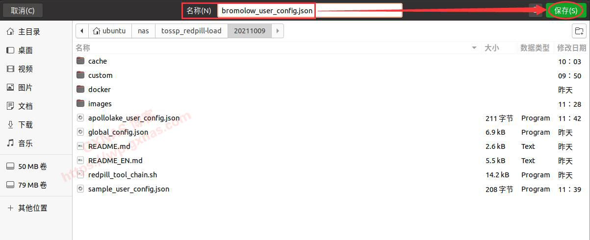 13、名称这里写:bromolow_user_config.json(编译DS3615xs的引导,必须要用此文件名,不可以更改),保存;
