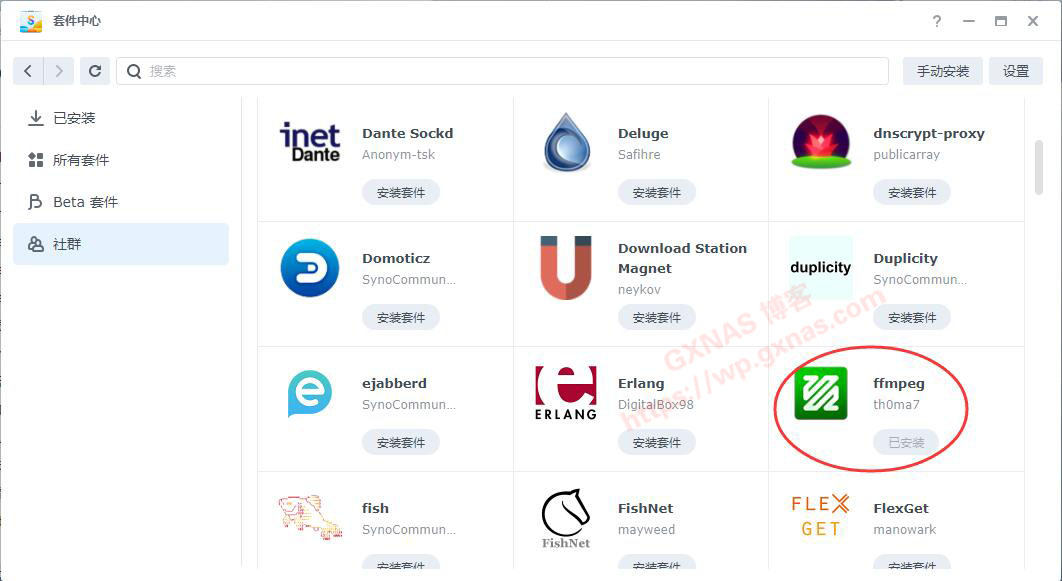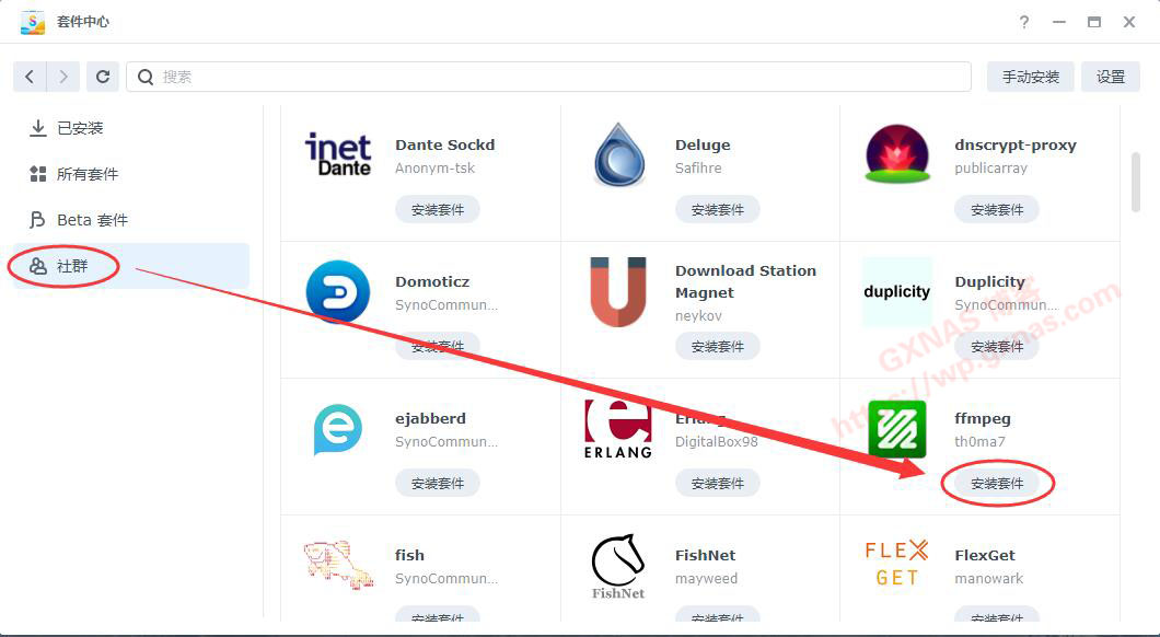 2、套件中心左边就会多出一个社群,点社群,找到ffmpeg,安装套件;