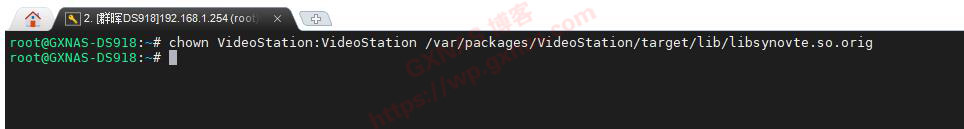 15、输入命令,设置Video Station套件原版libsynovte.so备份文件的权限;