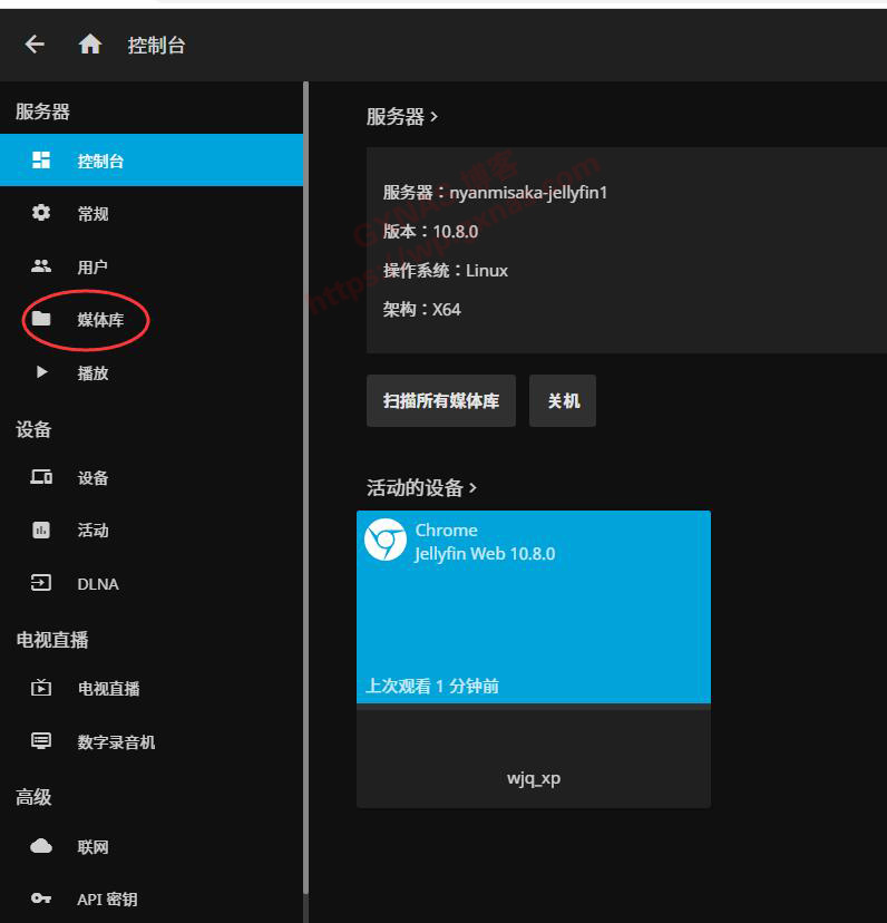 28、此时在控制台的首页会看到当前Jellyfin的版本为10.8.0,点左边菜单“媒体库”;