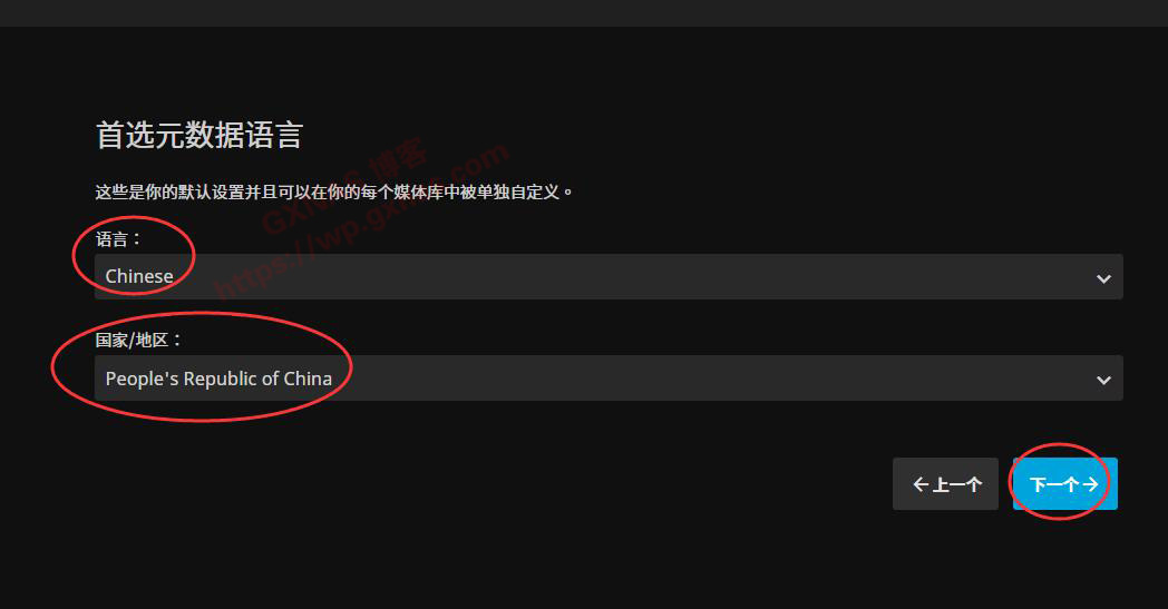 40、下向滚动菜单,找到媒体库设置,首选下载语言选“Chinese”,国家/地区选择“People's Republic of China”;