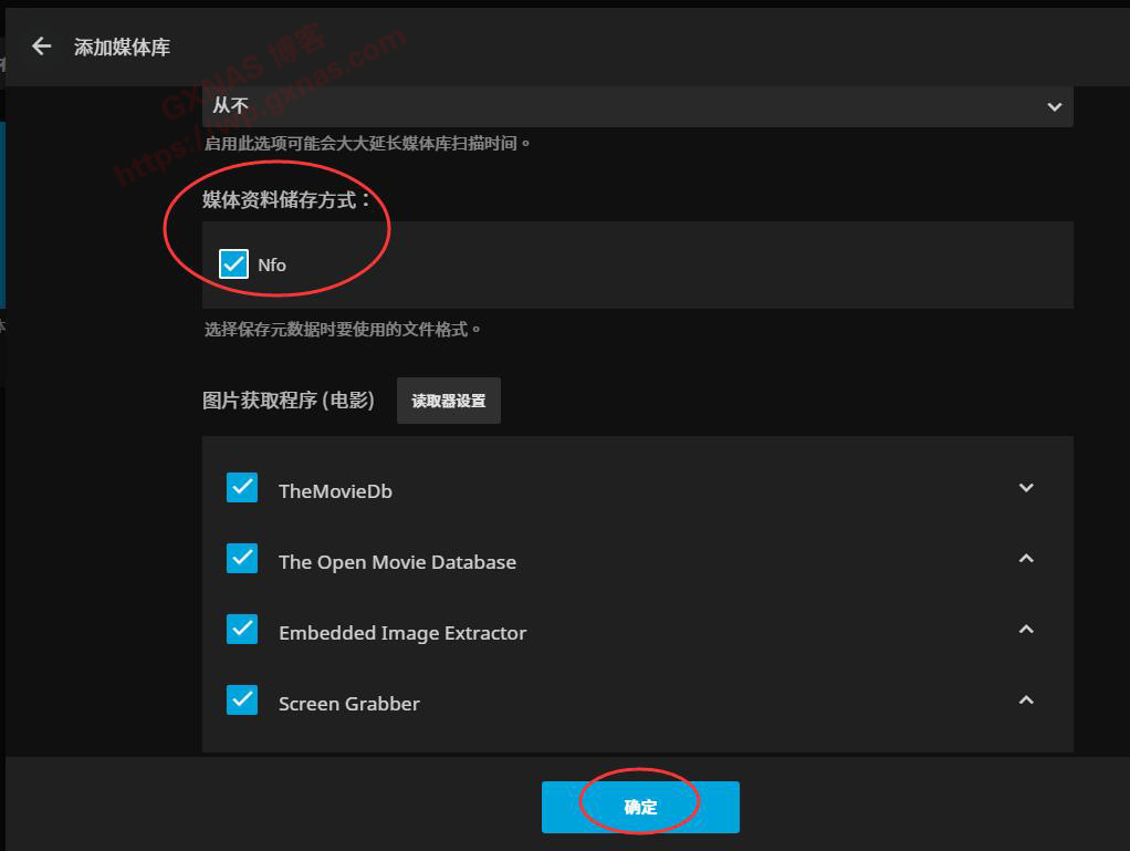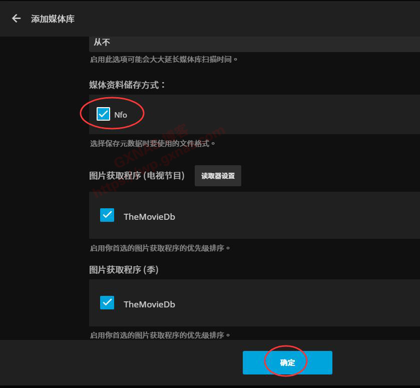 35、继续下向滚动菜单,找到“媒体资料储存方式”,在“Nfo”处打勾,其他的设置使用默认值,点“确定”;
