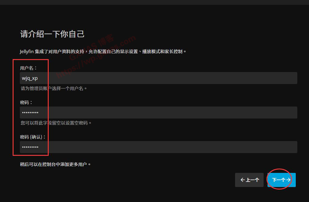 20、设置登录Jellyfin的管理账号和密码,下一步;