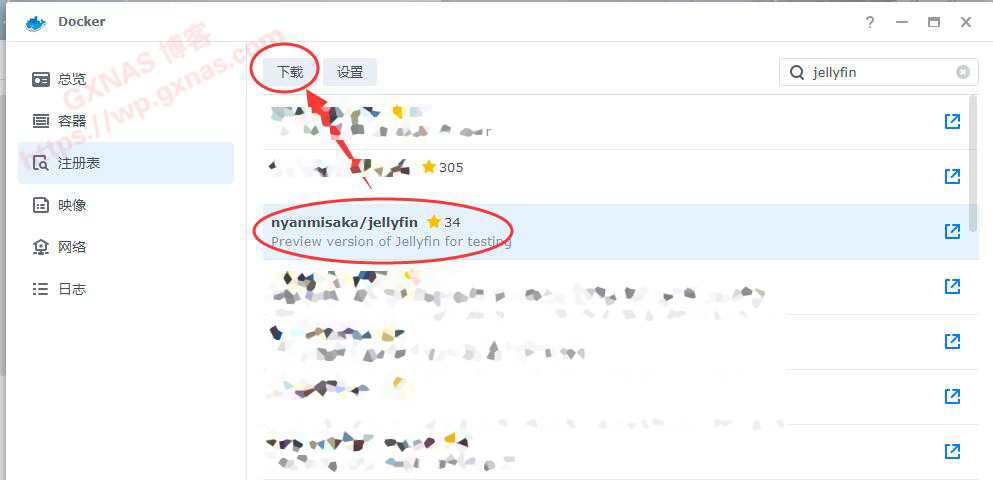 5、找到“nyanmisaka/jellyfin”,点“下载”,如果下载慢或者老是下载失败的话,请参考《修改docker加速地址提高镜像下载速度》教程设置docker加速;