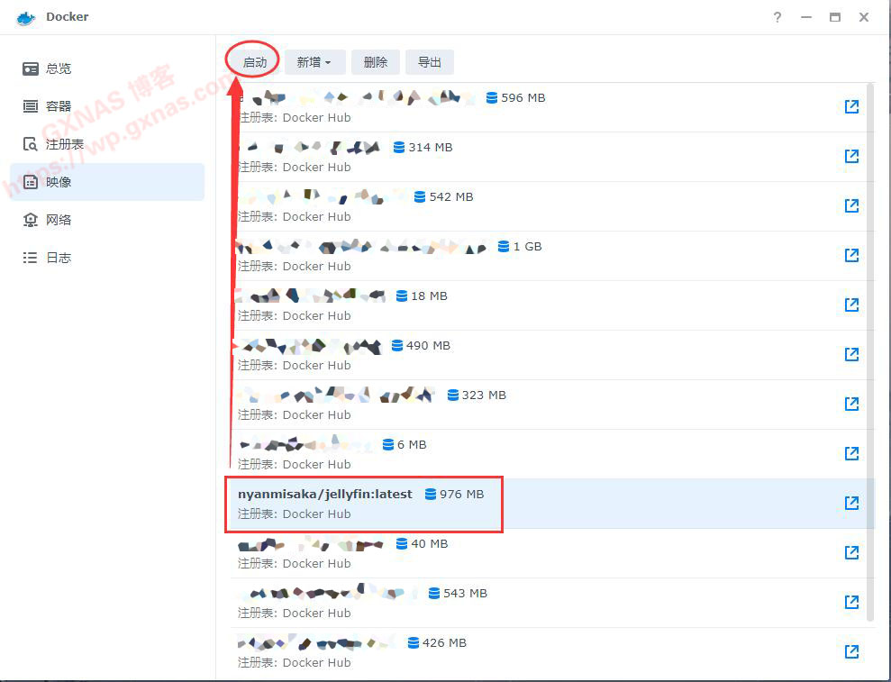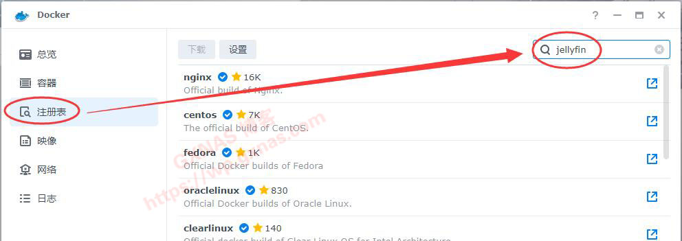 4、打开Docker,注册表输入jellyfin,回车;