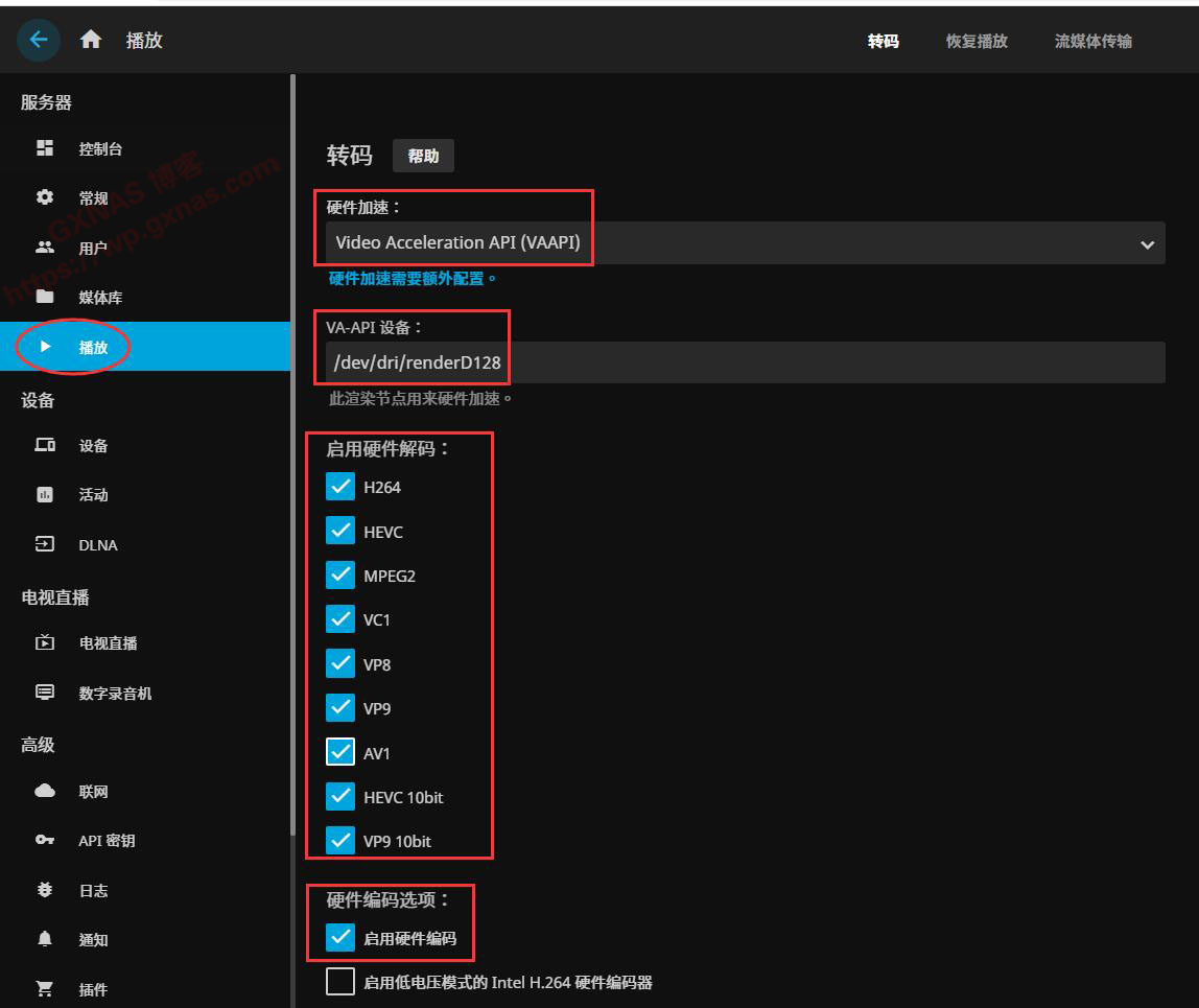 42、如果你的NAS支持硬件解码,点左边菜单“播放”,硬件加速选择“Video Acceleration API(VAAPI)”,VA-API设备选择“/dev/dri/renderD128”,把“启用硬件解码”显示的类型全部打勾,然后在硬件编码选项处把“启动硬件编码”打勾,保存;