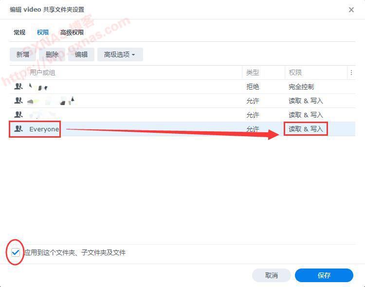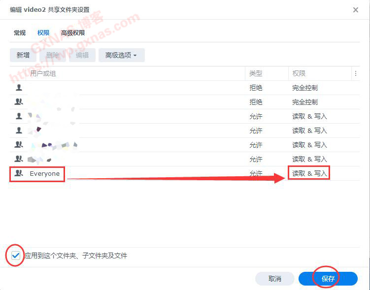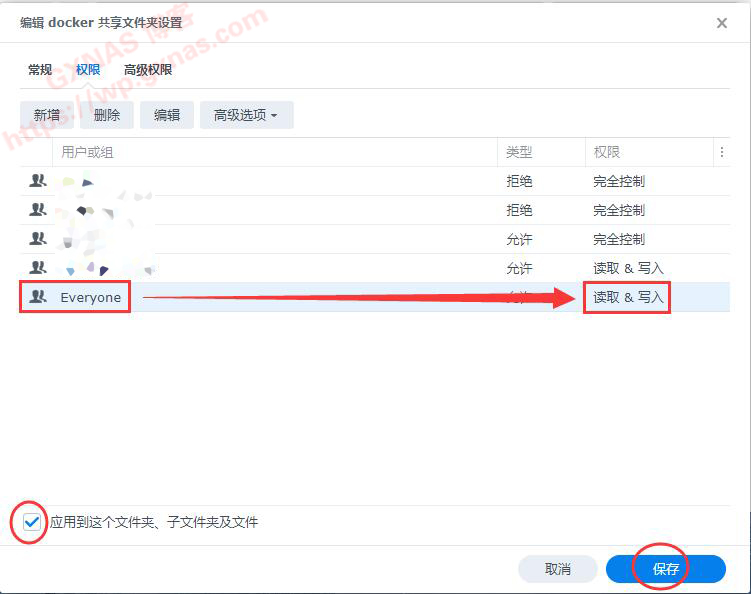 3、在File Station的docker文件夹右键,属性,权限,新增,给Everyone用户组添加读和写的权限,左下角的“应用到这个文件夹、子文件夹和文件”打勾,保存;