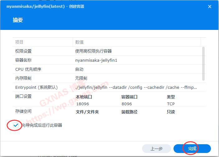 16、在左下角的“向导完成后运行此容器”打勾,点“完成”;