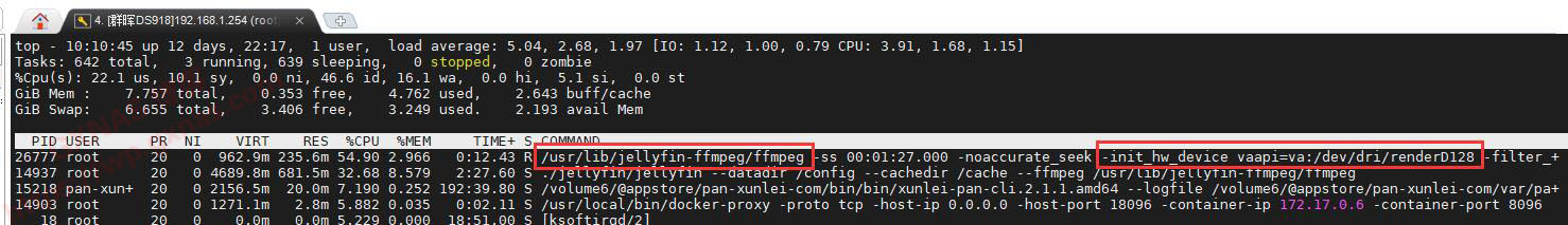 46、用root登录群晖的SSH下,输入top命令,查看播放信息中,jellyfin有显示“-init_hw_device vaapi=va:/dev/dri/renderD128”的字样,表示使用的是硬件解码,很完美!