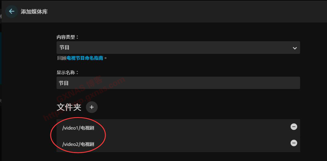 (2)根据需要添加影视文件所在的文件夹,比如我的NAS有两个影视的文件夹,所以设置了"video1"和"video2"两个装载路径,这个装载路径可以自己定义名称;