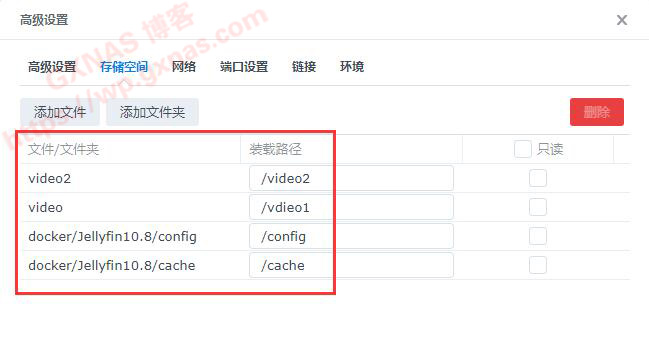 (1)在上面第2步操作中建立的cache和config两个文件夹,装载路径分别设置成“/cache”和“/config”,这两个装载路径不可以改名;