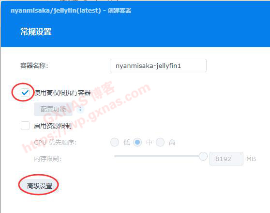 8、在“使用高权限执行容器”处打勾,再点“高级设置”;