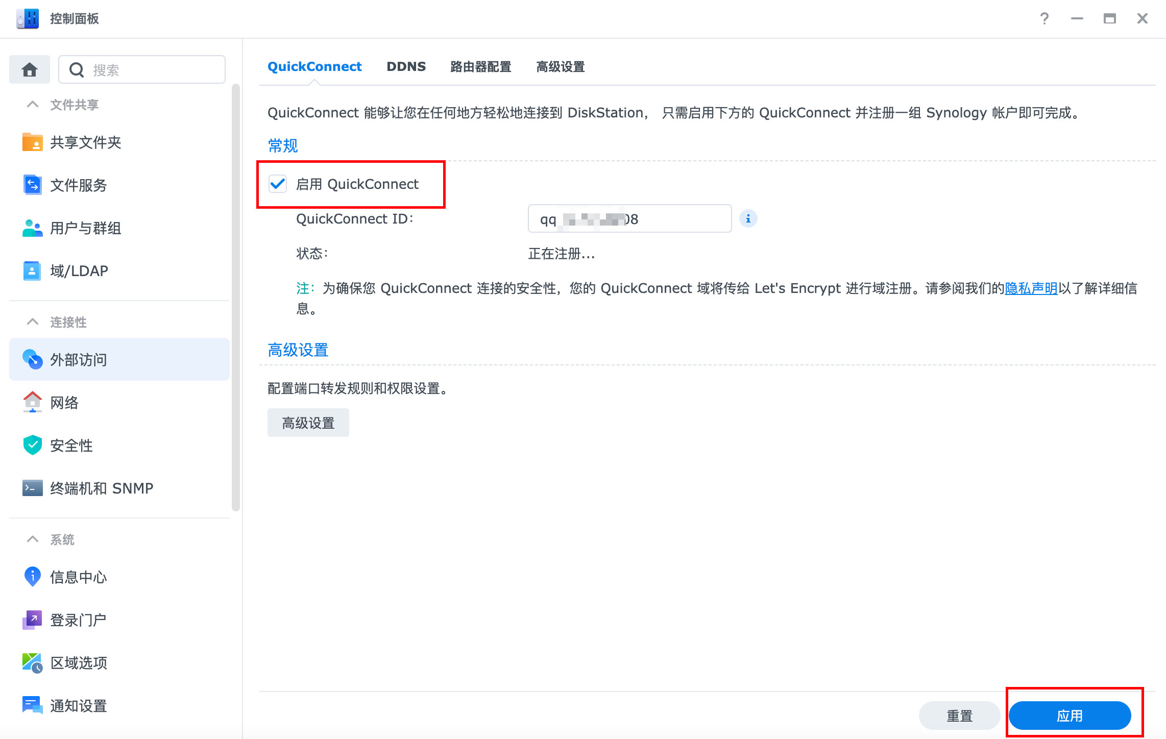 1、首先我们要解决外网访问群晖NAS的问题,最简单的是群晖的quickconnect(有公网ip或者自己设置内网穿透的可以直接略过),在群晖「控制面板」--「外部访问」--启用quickconnect,输入自定义的QuickConnect ID(这个就相当于是你自定义的DSM的访问域名),例如我自定义的就是 qqxxxxxxx8;