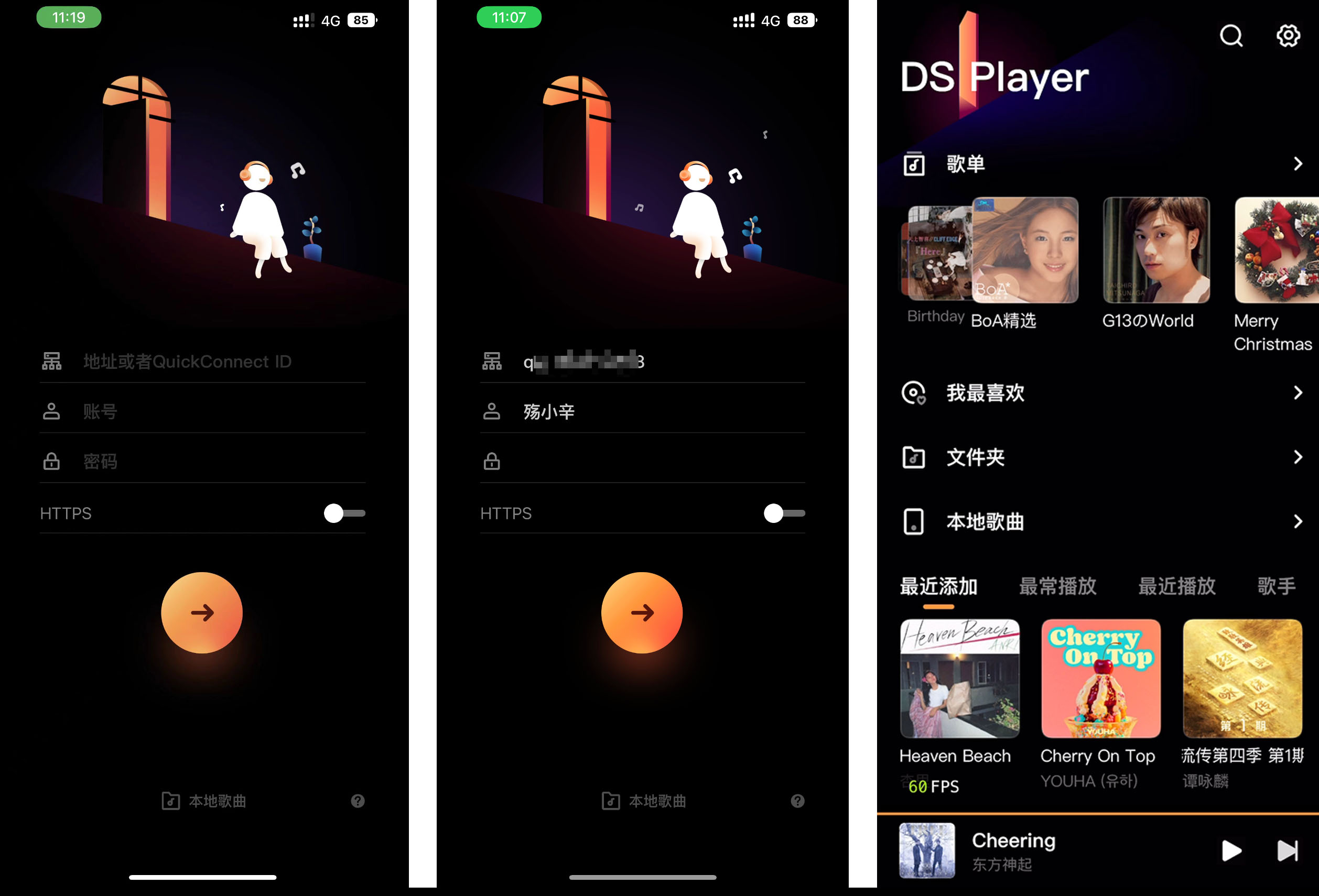 5、输入QuickConnect ID(或者你的外网地址)、群晖的用户帐号和密码登录,就可以听歌了;