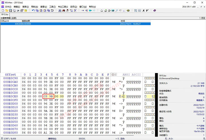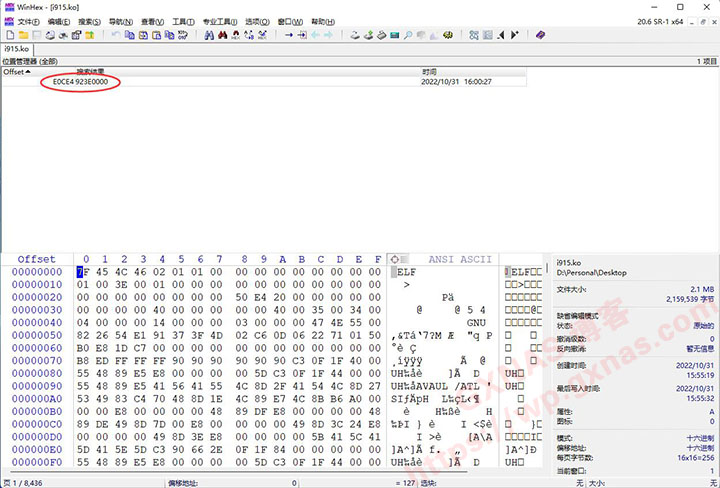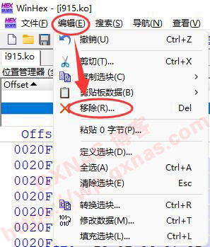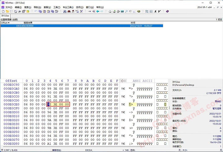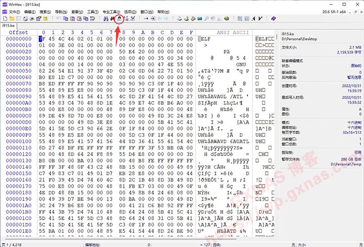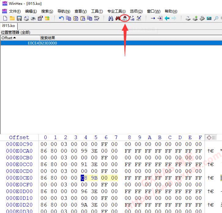 12、在Win电脑上下载【WinHeX】软件,解压出来并运行软件,点打开文件图标,找到保存在电脑桌面的i915.ko文件,打开;