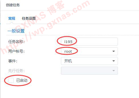 6、任务名称写一个非中文的名字,用户账号要改为root,把“已启动”的打勾去掉;
