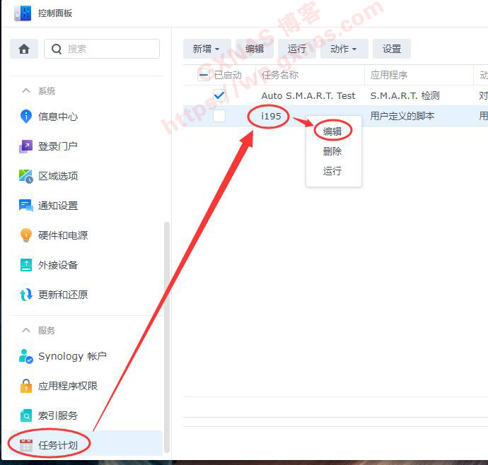 37、群晖打开控制面板,任务计划,找到第5步骤建立的任务,右键,编辑;