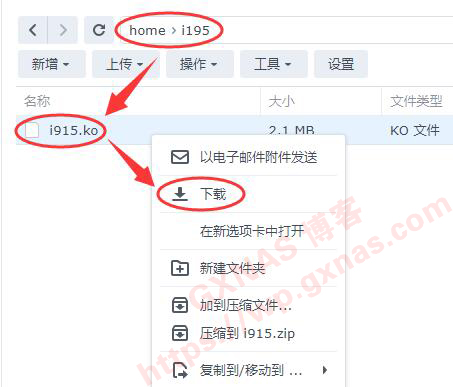 10、回到Files Station,进入建立好的i195文件夹,刷新一下就看到已经有文件了,在文件上点右键,下载;