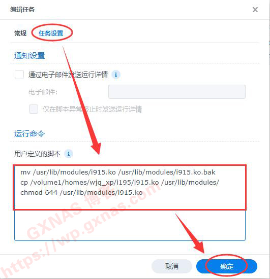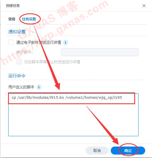 7、任务设置,用户定义的脚本,复制以下内容,替换成自己NAS实际路径(把 /volume1/homes/wjq_xp/i195 替换成在第4步骤获取实际路径),确定,这一步的目的是为了把当前系统使用的核显文件i915.ko复制出来: