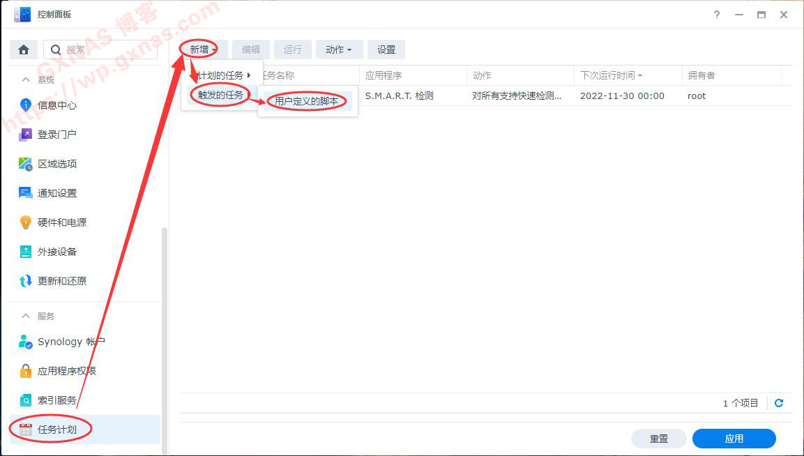 5、打开群晖控制面板,任务计划,新增,触发的任务,用户定义的脚本;