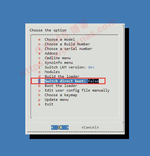 1、如果你使用的是不低于v1.0-beta3版本的项目文件,那么按照《史上最简单的黑群晖DSM7.X引导编译方法,小学生都能操作!》教程做完第25步骤的时候,屏幕菜单上的内容会显示“Switch direct boot:false”,先确认一下光标停留在这行内容上面,然后按一次回车键;