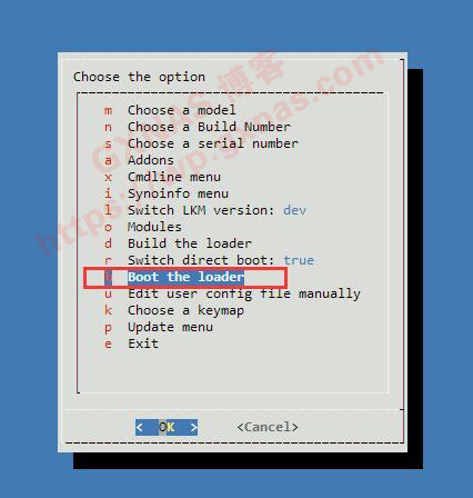 2、屏幕上的菜单内容会变成“Switch direct boot:true”,同时光标会自动跳到下一行“Boot the Loader”;