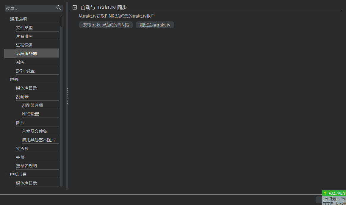 远程服务器,属于高级功能了,需要到Trakt.tv网站注册个帐号,然后就可以同步你观看记录到Trakt.tv网站上,例如已观看的影视节目和收藏的影视节目等。