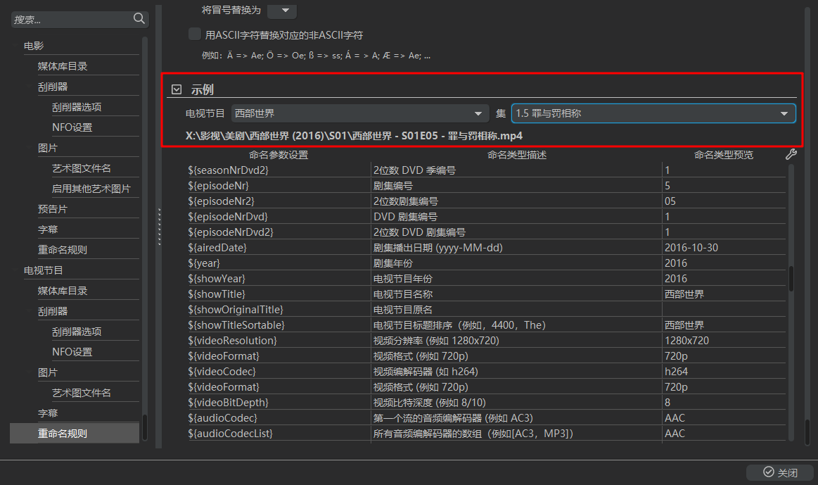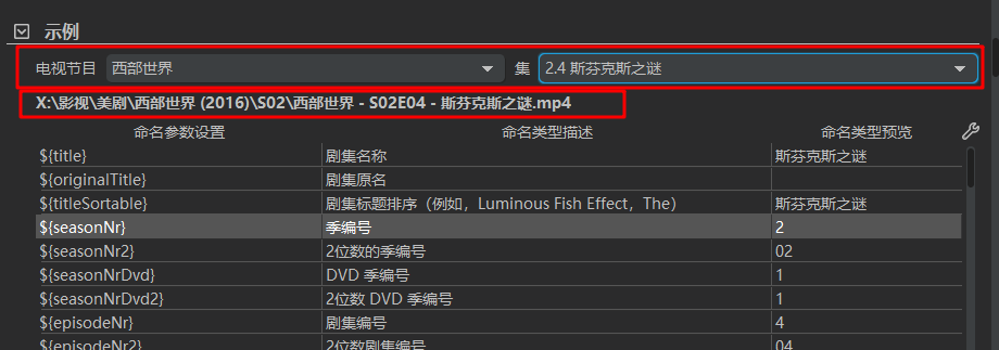 ${showTitle} – S${seasonNr2}E${episodeNr2} – ${title} 这段就是对应上面的命名规则后的效果, ${showTitle} =西部世界, S${seasonNr2}E${episodeNr2} =S02E04, ${title} =斯芬克斯之谜,最终命名结果就如上图所示,想在添加其他的名称,比如视频分辨率,编码等等,可以按照下面的命名参数设置自行修改,命名类型描述里面都有对应的功能描述,可以根据需求自行修改。