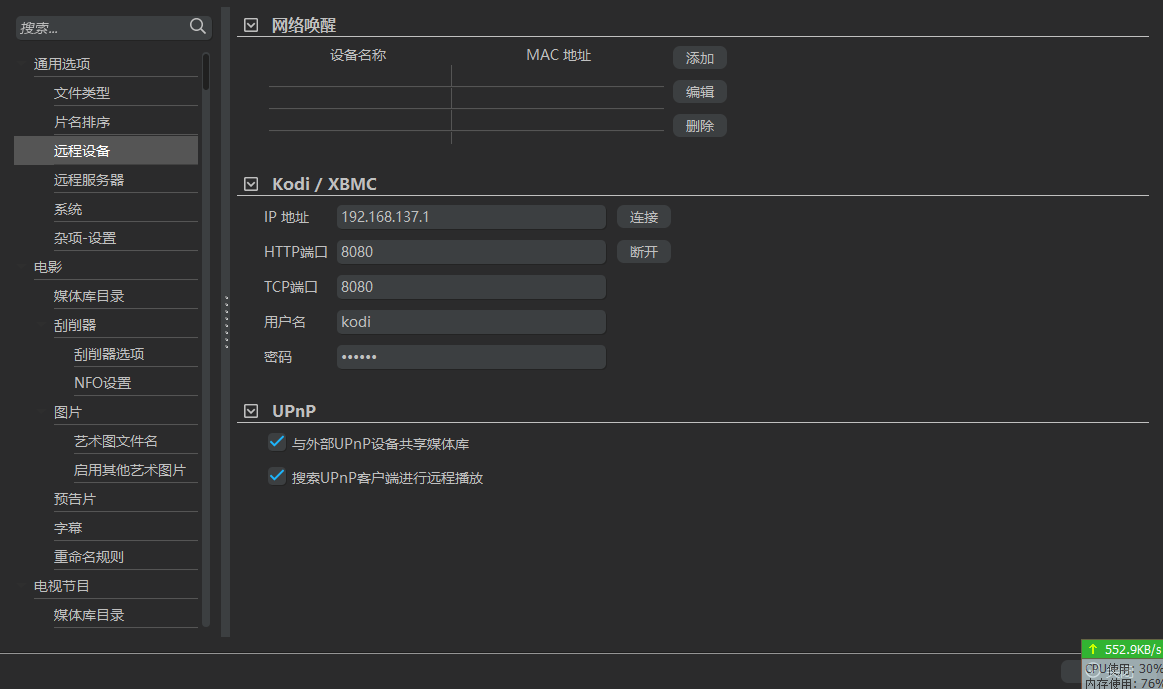 远程设备:这里可以连接你的KODI,进行唤醒和简单的控制,还有共享媒体库等。